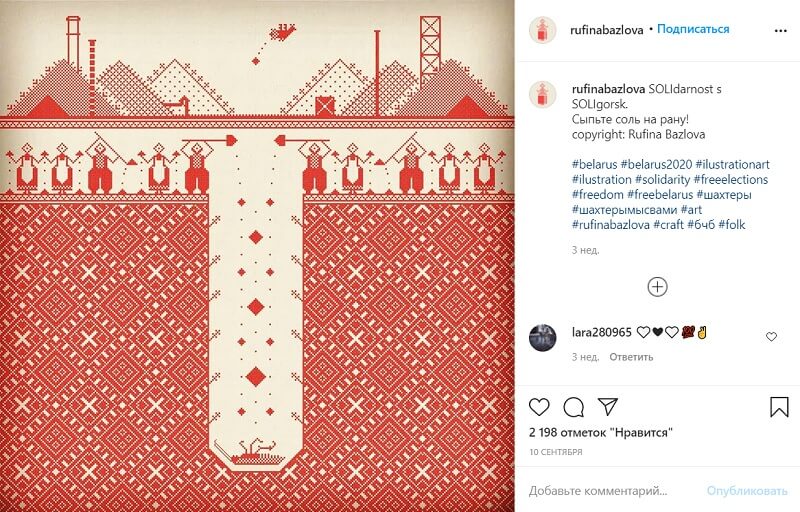 Художница Руфина Базлова — белоруска, но живет и работает в Праге. Она создала серию картин о белорусских протестах, стилизованную под традиционную вышивку крестиком. Например, вот такой арт посвящен солидарности с городом Солигорском. В Инстаграм художницы также можно увидеть картины, посвященные Окрестино, женским маршам, «диджеям перемен».