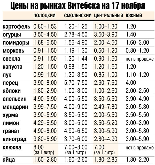 Цены на овощи и фрукты на Полоцком, Смоленском и Центральном рынках Витебска.