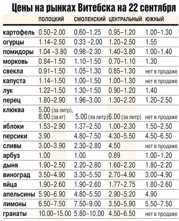 Цены на овощи и фрукты на Полоцком, Смоленском, Южном и Центральном рынках Витебска.