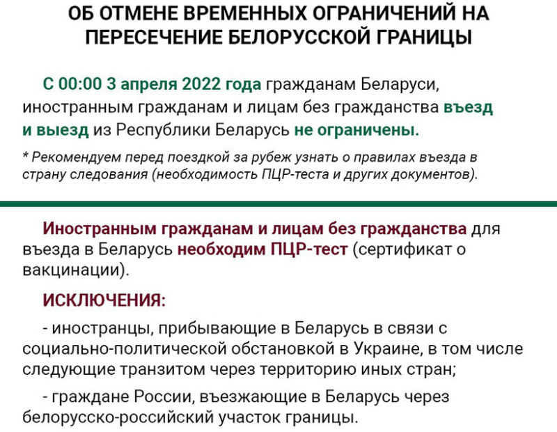 «С 00:00 3 апреля для граждан Беларуси въезд в страну и выезд не ограничены. ПЦР-тест (сертификат о вакцинации) не требуется.