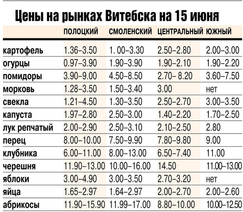 Цены на овощи, фрукты и ягоды на Полоцком, Смоленском, Центральном и Южном рынках Витебска