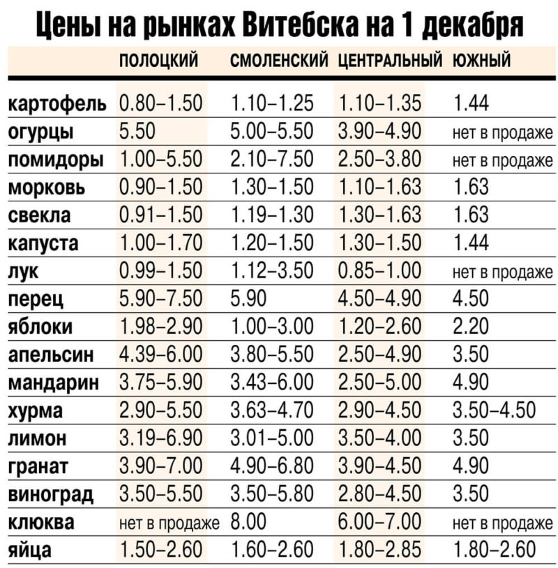 Цены на рынках Витебска 1 декабря