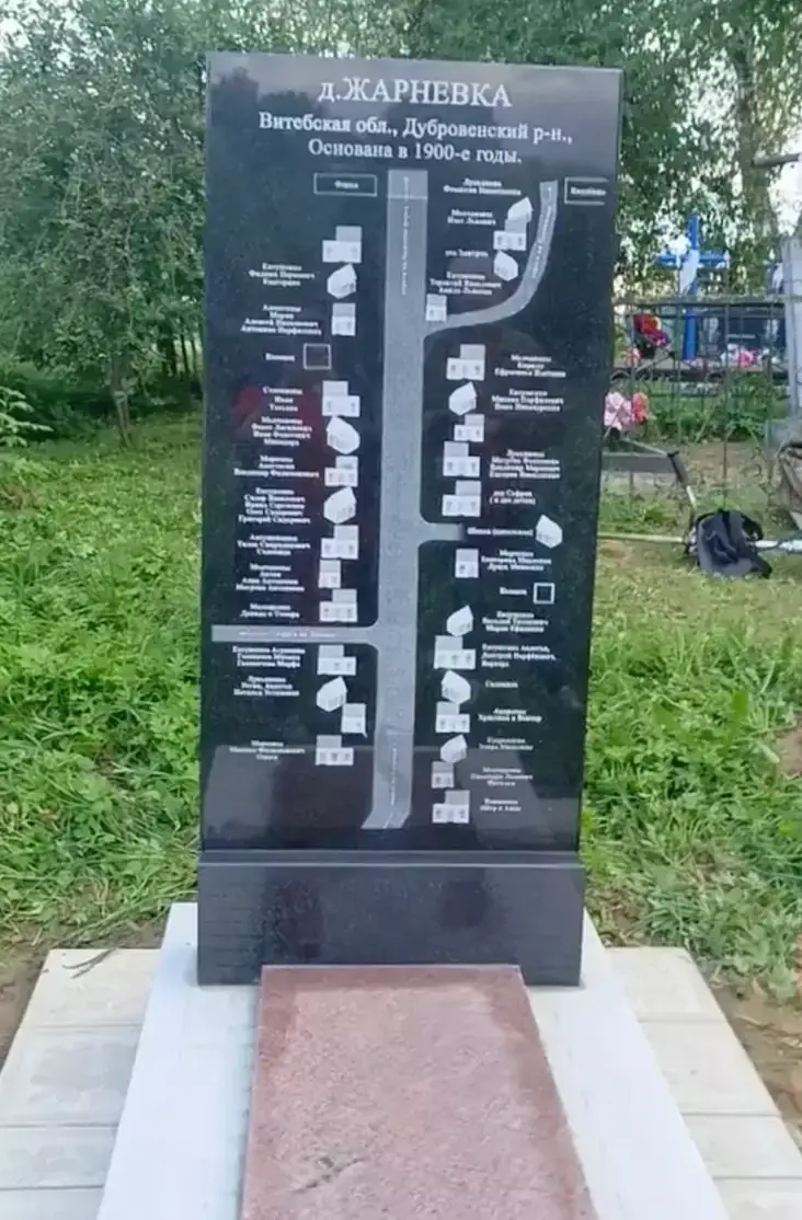 Мария Сидорова и Светлана Мухина, жительницы Витебска, установили мемориальную доску в родной деревне Жарнёвка Дубровенского района. Эта деревня практически полностью заброшена — в ней больше никто не живёт. На табличке указаны имена местных жителей, обозначены улицы, школа, колодцы, ферма и дороги.