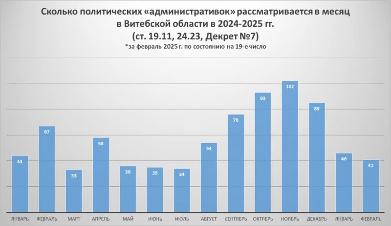Февраль 2025 года может стать новым пиком по числу политических административных дел в Беларуси. Только за вчерашний день в судах Витебской области рассмотрели минимум четыре дела, связанные с нарушениями ст. 19.11 Кодекса об административных правонарушениях. Это лишь часть общей картины, которая складывается в регионе, обратил внимание телеграм-канал «Витебск, я гуляю!».