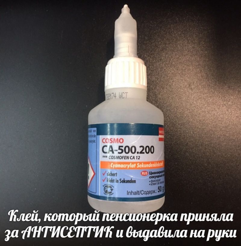 Пожилая женщина перепутала клей с дозатором антисептика. С кем не бывает, но все-таки предупредите близких, особенно в годах, что не все, что стоит рядом с кассой, — антисептик для рук.