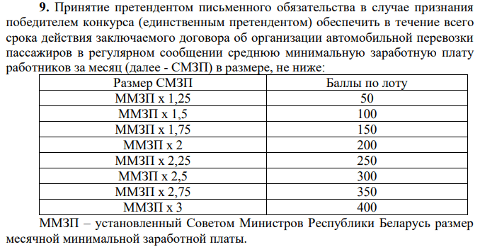 В настоящее время Витебским областным коммунальным транспортным унитарным предприятием «Оператор перевозок» проводится конкурс на право выполнения автомобильных перевозок пассажиров в регулярном сообщении в г.Полоцке и Полоцком районе. Полоцкий районный исполнительный комитет, который является заказчиком перевозок, согласовал критерии оценки конкурсных предложений участников, содержащие критерий, не относящийся к процессу выполнения автомобильных перевозок, что противоречит нормам пункта 2 статьи 23 Закона № 94-З.
