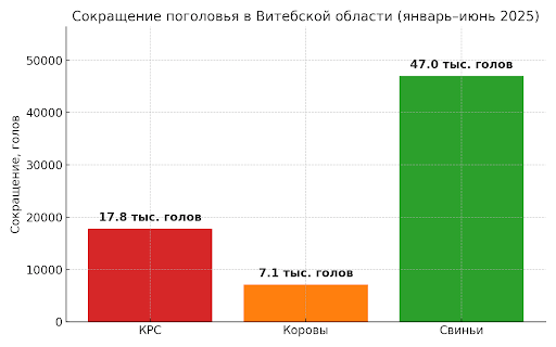 По данным КГК, за январь–июнь 2025 года численность крупного рогатого скота в области сократилась почти на 18 тысяч голов. Только коров — на 7,1 тыс., свиней — на 47 тысяч. Падёж происходит массово: скот недокармливают, не долечивают, корма портятся. И его вынуждены скрывать. Так, в Миорском районе 504 павшие головы КРС были направлены на корм зверям — но официально в отчётах этого падежа не было вовсе.