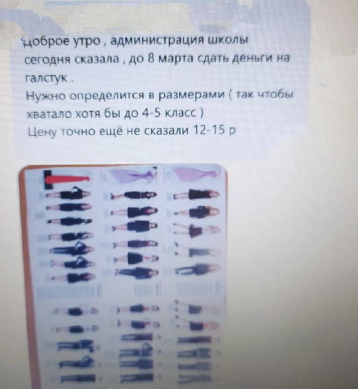В субботу в некоторых классах новой школы прошли родительские собрания. Как рассказала «Витебскому курьеру news» одна из присутствующих там мам, сын которой учится в начальной школе, им на собрании объявили, в том числе, о галстуках.