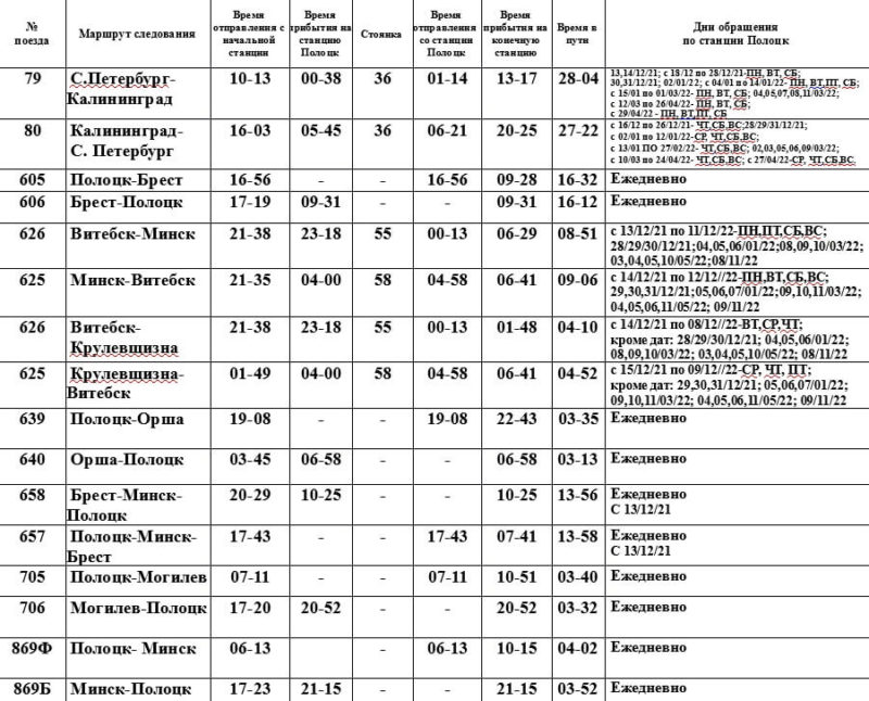 Взамен поезда Полоцк–Минск с отправлением в 16-25 теперь будет курсировать Полоцк–Минск–Брест с отправлением в 17-43, маршрут следования пройдет через Крулевщизну, Молодечно, Минск, Барановичи, Ляховичи, Ганцевичи, Пинск, Дрогичин, Кобрин, Жабинку.