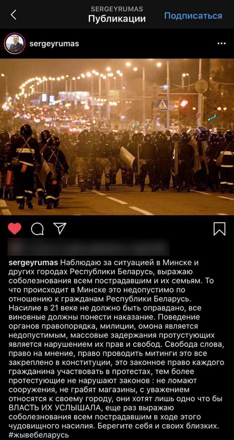Экс-премьер Беларуси Сергей Румас (занимал пост до 3 июня 2020 года) открыто поддержал протестующих в своём инстаграме, сопроводив текст хэштегом #жывебеларусь.