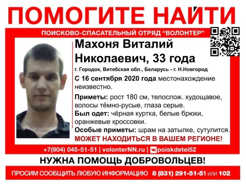 С 16 сентября разыскивают 33-летнего мужчину из Городка. Махоня Виталий Николаевич 180 м ростом, худощавого телосложения. Виталий был одет в черную куртку, белые брюки и оранжевые кроссовки.