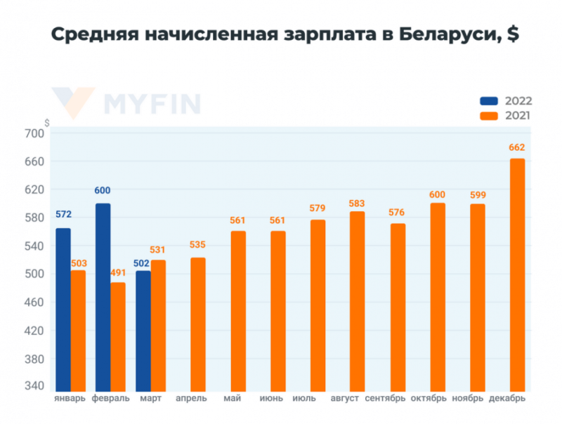 В марте-2022, по оценкам экспертов, был установлен новый двенадцатимесячный минимум. Абсолютный максимум был зафиксирован совсем недавно – в декабре 2021-го – 662 доллара. Снижение зарплаты в марте 2022-го по сравнению с мартом прошлого года (в долларовом выражении) составило 5,4%.