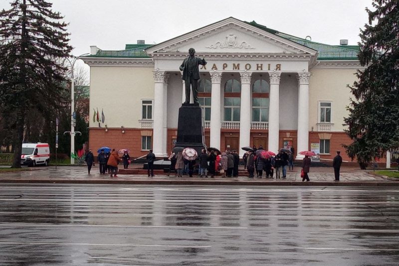 А 10-й раніцы прыхільнікі КПБ сталі падцягвацца да будынку філармоніі. На вуліцы імжыла, праўладныя камуністы хаваліся пад дахам на ганку будынку. Роўна ў 10.00, па камандзе, пайшлі да помніка – каля 30 чалавек на чале з першым сакратаром Аляксандрам Дзядзінкіным.