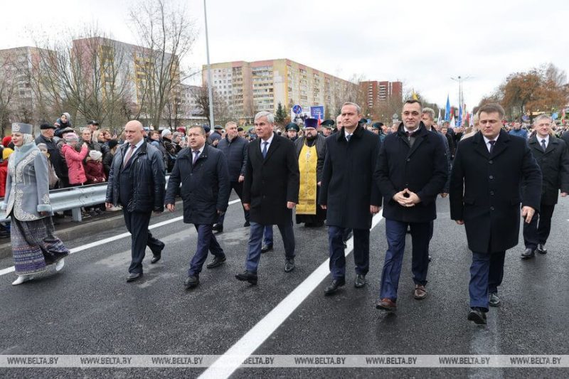 «Наше поколение помнит, какой это был красочный и яркий праздник — День Октябрьской революции. И сейчас мы традиционно открываем накануне этого события больницы, школы, мосты. У нас на витебской земле было всего построено 358 мостов и путепроводов, и теперь, чтобы не уронить и не принизить вклад наших дедов и отцов, мы должны не просто поддерживать их в хорошем состоянии, а модернизировать, делать лучше, красочней в доказательство того, что мы высоко несем знамя побед наших предков. Сегодня мы опережающими темпами открыли очень нужный для Новополоцка и всей страны мост. За последние два года мы модернизировали и капитально отремонтировали около 27 сооружений и на ближайшие два года планируем еще 24 сооружения сделать. Обновленный мост в Новополоцке — это яркое свидетельство того, что мы развиваемся и смело идем вперед, как бы тяжело нам ни было», — отметил председатель облисполкома Александр Субботин.