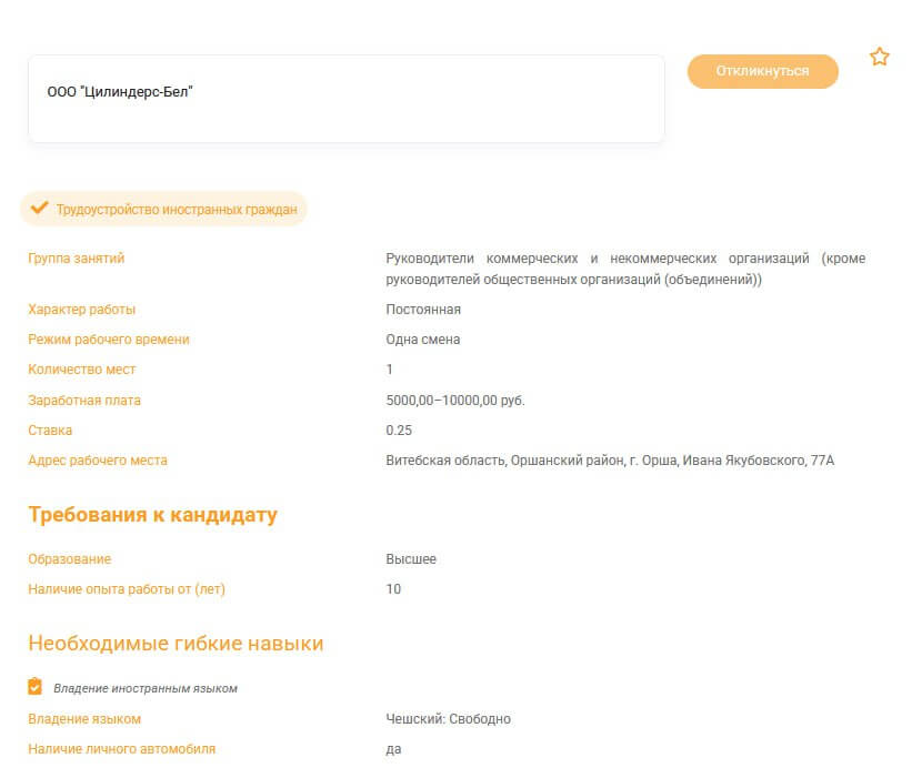 В Орше появилась вакансия с рекордно высоким окладом для региона — 10 000 рублей в месяц. Однако получить её могут лишь те, кто свободно владеет чешским языком. Речь идёт о должности директора в ООО «Цилиндерс-Бел» с загрузкой всего в 25% ставки.
