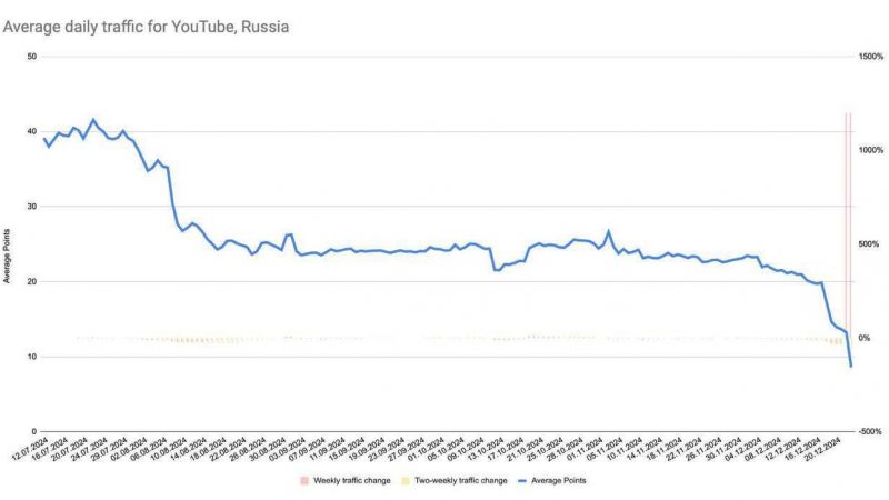 Трафик YouTube в России упал до минимального уровня, фактически подтверждая блокировку.