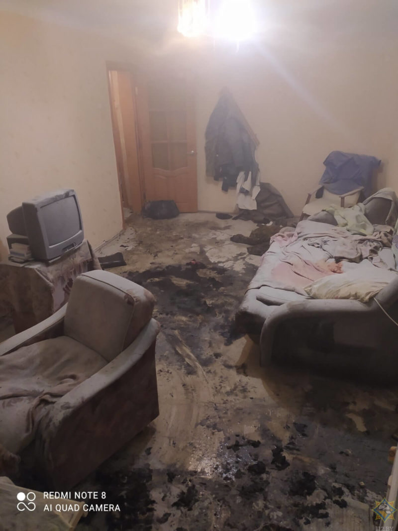 В результате пожара в комнате поврежден ковер и пол, закопчены потолок и стены. По данному факту проводиться проверка, причина пожара устанавливается. Рассматривается версия – неосторожное обращение с огнём при курении одним из спасенных, сообщает Витебское областное управление МЧС.