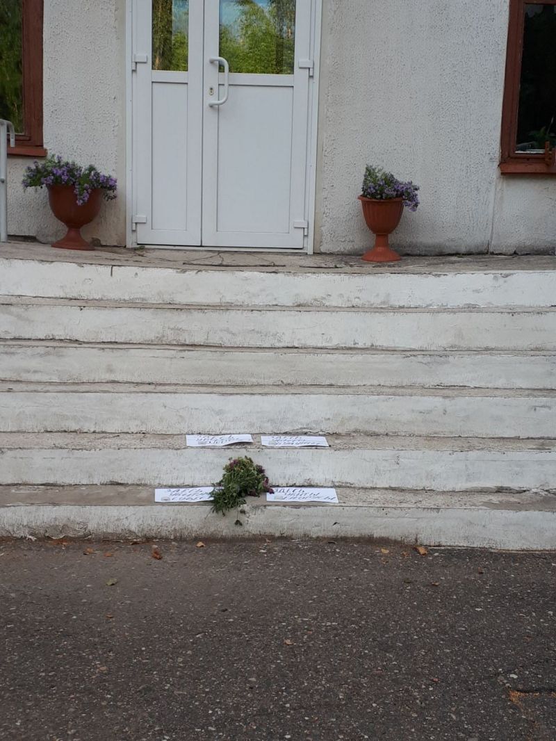 Этот маленький «флешмоб» устроили неизвестные на ступеньках СШ№42 по улице Петруся Бровки. На ступеньках школы лежат цветы и листки бумаги с надписями «Здесь убиты голоса», «Здесь убиты белорусы», «Здесь убита совесть», «Здесь убито будущее».