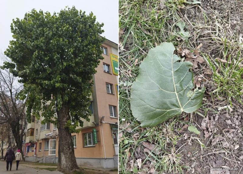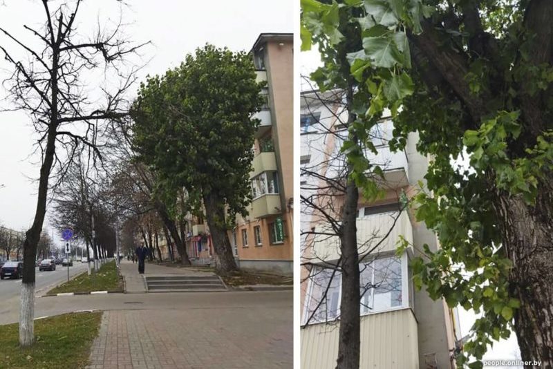 Прохожие удивленно рассматривают зелень и выясняют причину феномена. Мнения разделились: одни говорят, что перед нами липа, другие — что осина, прозвучала также версия, что это обычный тополь. После того как дерево коронировали несколько лет назад, что-то сломалось в природных механизмах. Жители близлежащих домов утверждают, что подобное происходит впервые, пишет people.onliner.by.