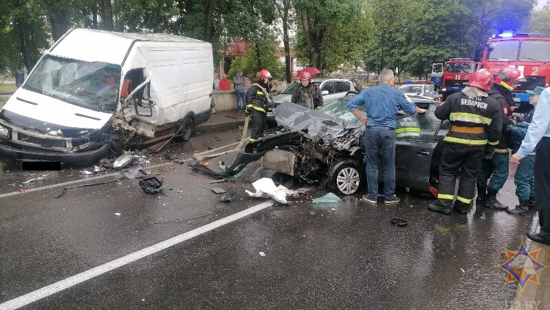 Спасателям сообщили об инциденте в 12.48. Когда те приехали на место, там находилась толпа очевидцев. В салоне легковушки был зажат водитель — его ноги оказались заблокированы приборной панелью. Работники МЧС помогли извлечь пострадавшего при помощи специального аварийно-спасательного инструмента: пришлось срезать крепления сиденья и отогнуть его верхнюю часть. После того как медики наложили водителю воротник Шанца, спасатели извлекли его и передали врачам. Мужчина госпитализирован в Витебскую областную клиническую больницу, сообщает Витебское областное управление МЧС.