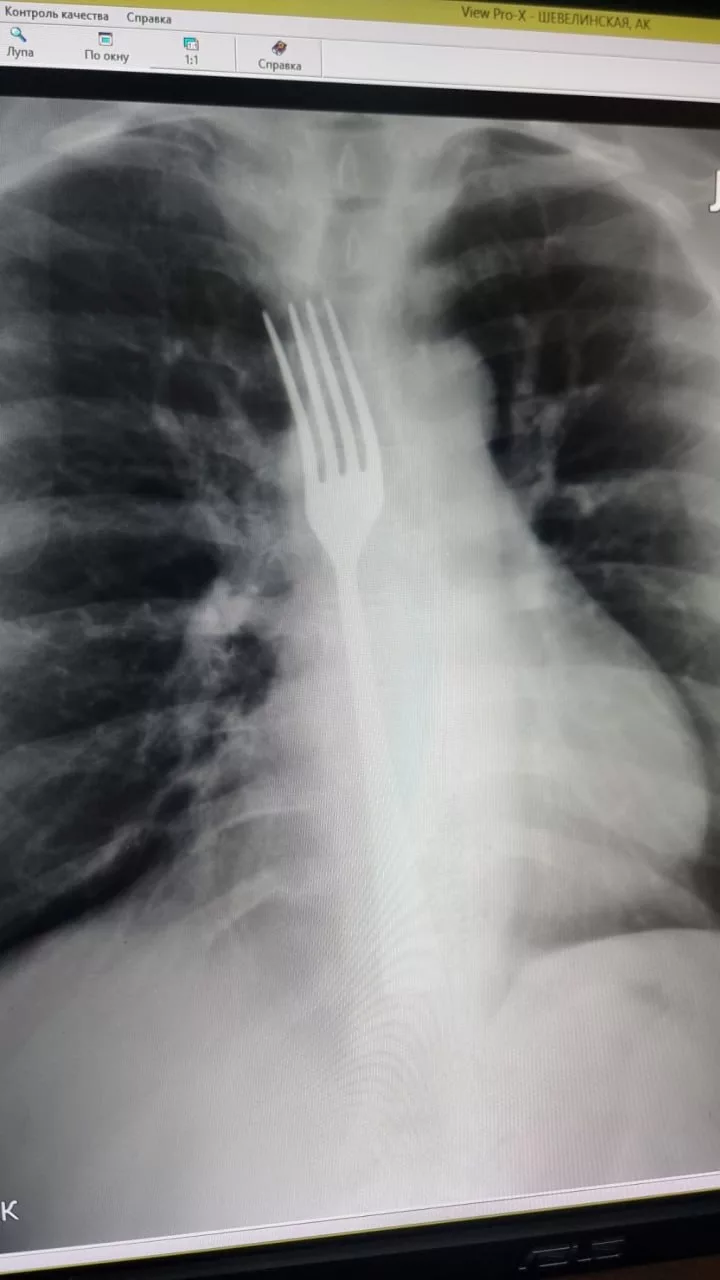 Сначала под наркозом врачи попытались сместить вилку эндоскопом. Им удалось продвинуть её в желудок. После этого хирурги сделали разрез и извлекли предмет. Медики отмечают, что повезло: вилка не повредила пищевод и не застряла в его стенке. В таком случае операция была бы сложнее.