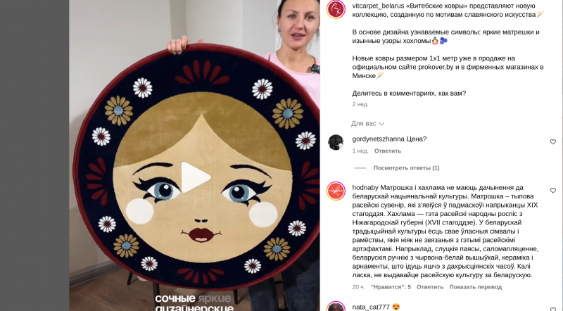 Фабрика «Витебские ковры» выпустила новую коллекцию — круглые коврики с матрёшками и хохломой. Вроде бы ярко, весело… Но пользователи тут же начали возмущаться: «Почему не белорусские орнаменты?», «Это российская символика, а не наша!» и «Вы вообще понимаете, что делаете?».