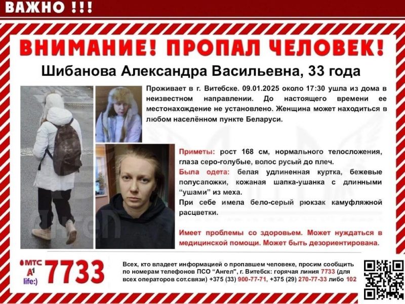 33-летняя Александра Шибанова пропала в Витебске. 9 января 2025 года около 17:30 она ушла из дома в неизвестном направлении. До настоящего времени её местонахождение не установлено.