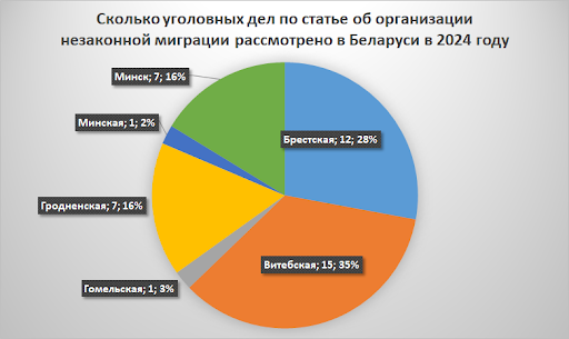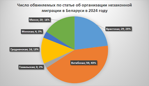 Наибольшее число привлечённых оказалось в Витебской области — 54 человека, или 43%. Однако важно подчеркнуть, что речь необязательно идет о жителях Витебской области. Уголовные дела возбуждались по территориальному признаку совершения преступления или задержания фигурантов. Такой подход позволяет сделать вывод, что «организаторы» планировали обеспечить перемещение людей через границу чаще всего с территории Витебской области.