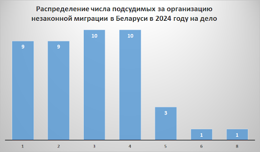 Чаще такие дела были массовыми: по одному делу могло проходить сразу несколько человек. Дел с одним фигурантом оказалось всего 9. На группы из трёх и четырёх человек пришлось почти половина случаев (по 10 дел). Было даже одно дело с 8 подсудимыми — его рассматривали в суде Советского района Минска в начале 2024 года.